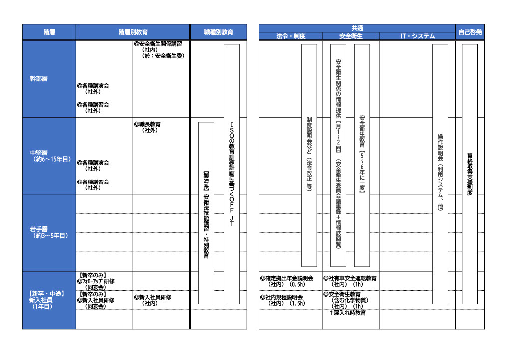 | 教育・人材育成制度 | 新入社員研修(社内・社外)、各種専門教育(外部講習)、資格取得教育(外部講習・試験等業務で必要な資格は、会社負担で取得が可能です。)